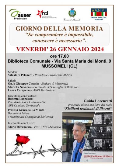 MUSSOMELI -Domani venerdì 26 gennaio, ore 17, presso la Biblioteca Comunale, sarà presentato il libro “Siciliani testimoni di libertà. Dodici storie di deportati nei lager nazisti” di cui Lorenzetti è autore. Modererà l’incontro Totò Pelonero (AUSER provinciale), Porteranno i saluti il sindaco Giuseppe Catania, Mariella Navarra, presidente del Consiglio di biblioteca, e Laura Carapezza per l’ ANPI Mussomeli. Dialogheranno con l’autore Roberta Lanzalaco, presidente ARCI Caltanissetta, e Graziella Lo Manto, docente di lettere). Concluderà il presidente dell’ANPI di Mussomeli, Mario Difrancesco. “Alimentare la memoria – si legge in una nota dell’ANPI di Mussomeli, è un esercizio di umanità che vogliamo mantenere vivo e, per farlo, quest’anno – su invito dell’Auser provinciale di Caltanissetta e in collaborazione con ARCI Caltanissetta – saremo veicolo della testimonianza di Guido Lorenzetti, figlio di Andrea, vicesegretario del Partito Socialista clandestino durante la Resistenza, arrestato per la sua attività antifascista e deportato a Mauthausen, dove morì, nel 1944”.
