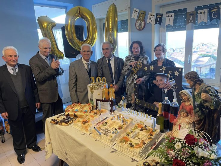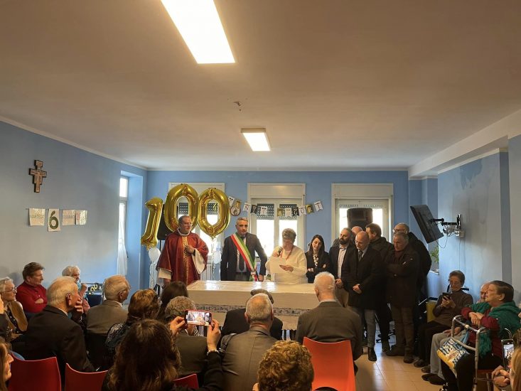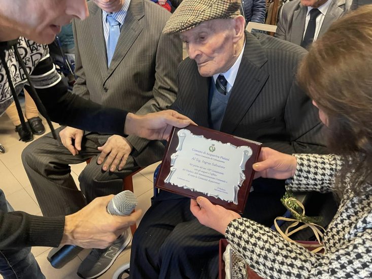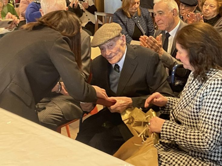 ACQUAVIVA PLATANI – Un fausto giorno per il nonnino Salvatore Ingrao per il raggiungimento del traguardo dei 100 anni, ospite di Casa Protetta S. Pio che lo ha festeggiato con una messa di ringraziamento, celebrata dall’Arciprete Padre Vincenzo Valenza, presenti familiari, amici ed autorità. “E’ stato un compleanno speciale – hanno commentato i dirigenti di Casa Protetta – zio Totó Ingrao ha compiuto 100 anni e nel pomeriggio di ieri abbiamo non solo festeggiato un traguardo tanto importante ma anche la famiglia amorevole e unita che lui ha creato.Un grazie di cuore va a tutta l’amministrazione comunale e al Sindaco Salvatore Caruso”. Al centenario è stata consegnata una targa ricordo, allietato da musica e balli e con l’assaggio dell’immanca