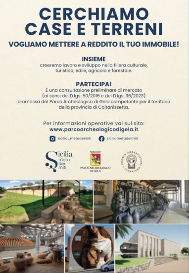 “Cerchiamo case e terreni, vogliamo mettere a reddito il tuo immobile!”. È lo slogan dell’iniziativa promossa dal Parco Archeologico di Gela, per tutti i comuni della Provincia di Caltanissetta, nell’ambito del progetto “Sicilia meta dei miti” e del “Premio Ambasciatori nazionali”.
