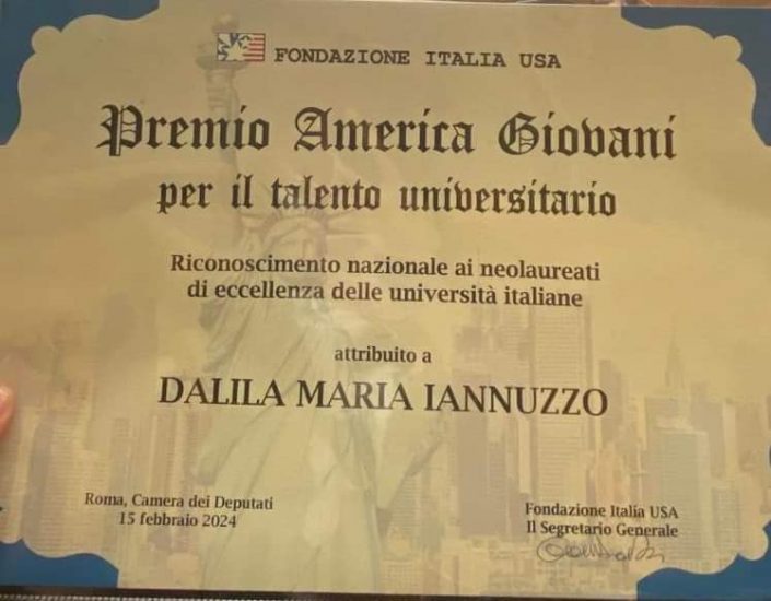 SOMMATINO. La giovane e talentuosa sommatinese Dalila Maria Iannuzzo, presso la Camera dei Deputati, ha ricevuto il prestigioso Premio America Giovani 2024 della Fondazione Italia USA.