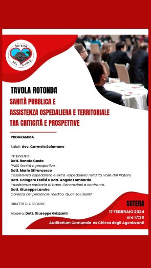 SUTERA – È stata organizzata per il 17 febbraio 2024 presso l’Auditorium Comunale ex Chiesa degli Agonizzanti una tavola rotonda dal titolo “Sanità pubblica e assistenza ospedaliera e territoriale tra criticità e prospettive”. Tema delicato nel panorama politico regionale e nazionale, il gruppo politico “Sutera nel Cuore” ha ritenuto fondamentale affrontare le sfide e le opportunità legate al settore sanitario anche a livello territoriale e con uno sguardo intergenerazionale. Interverranno il consigliere di minoranza Avv. Carmelo Salamone, il Dott. Renato Costa, il Dott. Mario Difrancesco, il Dott. Calogero Ferlisi, il Dott. Angelo Lombardo e il Dott. Giuseppe Landro. Modera il dott. Giuseppe Grizzanti, medico ed ex sindaco di Sutera. Tra le tematiche che verranno affrontate: la realtà e le prospettive del PNRR,