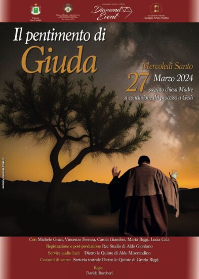 Vi aspettiamo ,dunque, Lunedì 25 marzo in Chiesa Madre con IO C’ERO-voce di voci sotto la croce, Mercoledì 27 marzo con il processo a Gesù e IL PENTIMENTO DI GIUDA. Si ringrazia L’associazione Amico Medico ,nella persona del Presidente Claudio Arcarese. L’amministrazione comunale, nella persona del Sindaco Gioacchino Comparato, e della Vicesindaco Marianna Guttilla. La Chiesa Madre di San Cataldo, nella persona dell’Arciprete Alessandro Giambra.