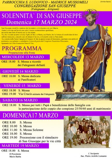 MUSSOMELI – Varato il programma della festa 2024 di San Giuseppe a firma del Presidente dell’omonima Congregazione Mario Barba e dell’arciprete Padre Achille Lomanto.. Sarà domenica 17 marzo la festa esterna nella chiesa Madre, dove è visibile l’artistico simulacro, esattamente nella cappella della navata a destra. Si incomincia mercoledì 13 marzo, in preparazione alla festa con la messa delle 18 a ricordo dei falegnami defunti; si prosegue il giovedì con la santa Messa dedicata ai panificatori; il venerdì con la santa messa e la Via crucis animata dai falegnami; sabato 16 marzo sanata messa per tutti i papà e benedizione delle coppie che compiono 25 – 50 – 60 anni di matrimonio. Domenica 17 marzo: sante messe alle ore 8 – 10 – 11 – 18. Alle ore 19, Processione per le vie della città. Il giorno 19, giornata liturgica, ore 18 santa messa.