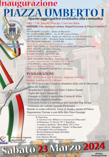 MUSSOMELI – Domani, sabato 23 Marzo 2024), si inaugura la Piazza Umberto I°, dopo oltre un anno di lavori di riqualificazione. L’evento, sarà preceduto, alle ore 17.00, dal seminario “Una contuinità urbana: Riqualificazione di Piazza Umberto” che si terrà presso la sala del Principe – Collegio di Maria “Batia”, dove si può ammirare il recente restauro. Sono previsti i saluti del sindaco di Mussomeli on. Giuseppe Catania, dall’assessore regionale ai LL.PP. Alessandro Arricò, dal Soprintendente ai BB.CC. ed ambiente di Caltanissetta Arch. Daniela Vullo, dal presidente Ordine Architetti Caltanissetta Arch. Piero Campa, e dall’ing. Massimo Ferrara della Co.fer Srl. Alle 17,30, ”La citta storica: nuovi luoghi per la comunità” con i relatori Toti Nigrelli, assessore comunale LL.PP., Enza Piazza psicologa, Enzo Musumeci restauratore, Baldo Levante – Levante SRL; alle 18,30 “Il progetto di Piazza Umberto” con il relatore arch. Maurizio Messina; Luisa Piazza – Arnia Centro artistico Culturale. Alle 18,45, Conclusioni. Modera l’incontro il giornalista Roberto Mistretta. Alle ore 19,00 taglio del nastro e a seguire animazione con banda musicale, musica di intrattenimento, artisti di strada, e degustazioni.