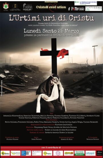 SAN CATALDO. Stasera, 25 marzo, doppio imperdibile appuntamento con la tradizione, la cultura e l’arte. Alle ore 19:00 presso la Chiesa Cristo Re di viale delle Rose, l’Associazione Culturale Cristorevolution porta in scena “L’URTIMI URI DI CRISTU”, dramma sacro di Bernardino Giuliana con la regia di Ivano Ferrara.