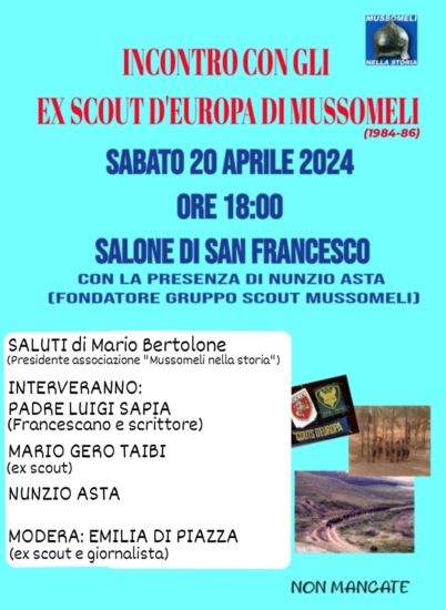 MUSSOMELI – Sarebbe il caso di dire “c’era una volta” il gruppo scout d’Europa, fondato a Mussomeli circa quarant’anni fa da Nunzio Asta frate del convento di San Francesco con un centinaio di ragazzi iscritti. Una realtà che purtroppo, durò solo circa tre anni, dal 1984 al 1986. A distanza di alcuni decenni, per iniziativa del presidente dell’Associazione “Mussomeli nella Storia”, Mario Bertolone è stato proposto un incontro fra tutti gli ex, aperto anche ad altri, per parlare di quella esperienza ed, eventualmente, riproporla. L’incontro è fissato per sabato 20 aprile 2024 alle ore 18 presso il salone San Francesco. Il programma prevede l’iniziale saluto del Presidente Bertolone, l’intervento del francescano e scrittore Padre Luigi Sapia, l’intervento dell’ex scout Mario Gero Taibi e del fondatore del gruppo Nunzio Asta. Modererà l’incontro l’ex scout e giornalista Emilia Di Piazza.
