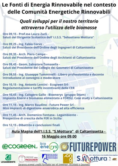 Giovedì, 16 maggio, a partire dalle ore 09:00, presso l’aula magna dell’Istituto “S. Mottura” di Caltanissetta, si terrà un convegno avente ad oggetto le opportunità derivanti dall’utilizzo delle fonti di energia rinnovabili e più specificamente delle biomasse, anche in riferimento alle comunità energetiche rinnovabili, di cui si parla sempre più frequentemente.