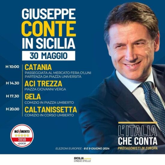 Conte, in Sicilia per elezioni europee, farà tappa nel capoluogo nisseno, giovedì 30 maggio, alle ore 20 per un comizio in Corso Umberto.