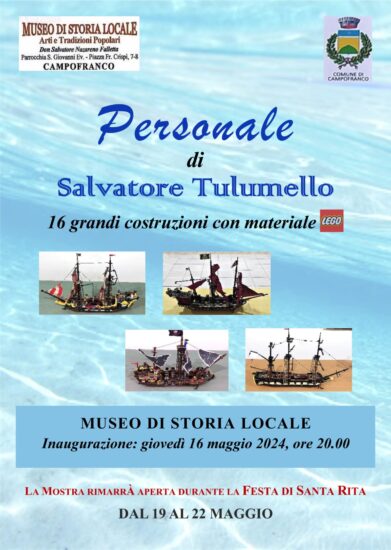 CAMPOFRANCO – Ritorna, dopo quasi due anni, ad esporre le sue ultime creazioni il nostro Salvatore Tulumello, già Luogotenente dei Carabinieri. Sedici costruzioni assemblate con migliaia di piccoli componenti della Lego.Sono il frutto di tanta passione, pazienza, perizia e volontà. La mostra è aperta a tutti ogni giorno, dalle ore 9.00 alle 12.00.Per visite fuori orario o di gruppo telefonare a:333 905 7466 – 338 469 5781Foto: n. 1- la visita graditissima di Mons. Onofrio Castelli, Vicario del Vescovo della Diocesi, che ammira con interesse e da vicino una costruzione; n. 2- foto ricordo con il Luogotenente Tulumello, il Vicario Castelli, l’arciprete Calabrese, il sindaco Nuara e il direttore del Museo Nicastro .