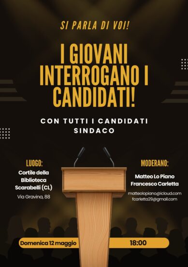 Si capovolgono i ruoli almeno per una volta. Sarano gli studenti ad interrogare i candidati sindaco. Da un’idea di due giovani liceali Matteo Lo Piano e Francesco Carletta è nato il confronto fra candidati sindaco moderato dai giovani. Domenica 12 maggio alle 18 nell’atrio della Biblioteca Scarabelli. Hanno accettato l’invito gli aspiranti alla poltrona di primo cittadino, Sergio Castiglione, Roberto Gambino, Angelo Failla, Annalisa Petitto, Ignazio Antonio Riggi, Walter Tesauro. Sarà un modo per farsi conoscere dalle giovani generazioni e raccontare loro qual è la loro idea di città. Non si parlerà solo di politiche giovanili ma di tutti i punti del programma elettorale visti con gli occhi dei ragazzi. I problemi le criticità di una città che non è a misura delle giovani generazioni. Una città dalla quale dopo il liceo i ragazzi tendono a scappare nella quale ritornano solo per le feste comandate.