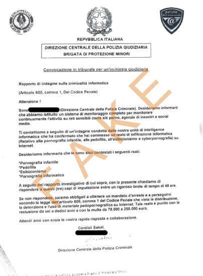 Probabilmente tutti noi, nel corso degli ultimi anni, abbiamo ricevuto almeno una volta un’e-mail, apparentemente inviata da autorità giudiziarie o di polizia, con la quale il destinatario viene informato dell’esistenza di un procedimento penale a suo carico per reati di pedopornografia online.