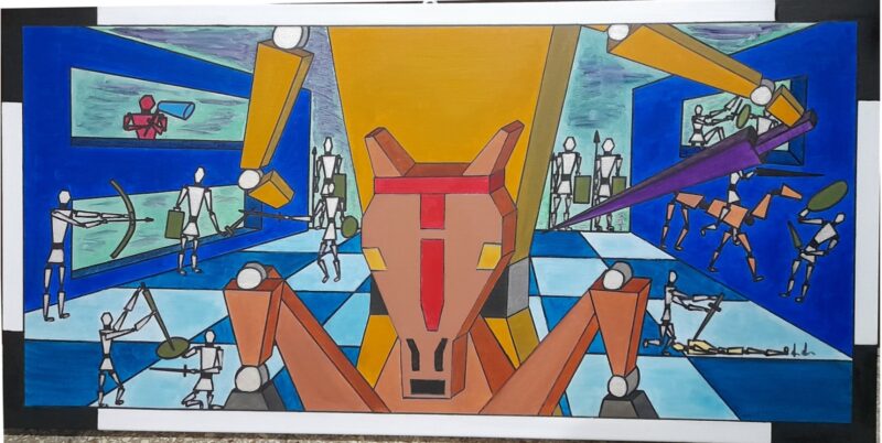 Al termine dell’evento organizzato da “PitturiAmo” con presidente il Dott. Argentati Antonino, la redazione di PitturiAmo selezionerà, 25 artisti fra i più interessanti e fra quelli che avranno ricevuto le maggiori attenzioni da parte del pubblico, saranno inseriti nella Top Selection di PitturiAmo e potranno entrare in contatto con i migliori galleristi internazionali. Gli stessi 25 artisti saranno pubblicati su la “Repubblica”, uno dei più importanti e conosciuti quotidiani nazionali, il giorno 8 Settembre 2024. Il Dipinto di Sotir selezionata da “PitturiAmo” in occasione del premio internazionale d’arte con sede a New York, è un convulso di azioni che riassumono una battaglia, Sotir ci riporta ai tempi del grande Alessandro Magno, ma in particolar modo al suo cavallo “Bucefalo”. L’artista utilizza una metafora paragonando il sacrificio di Bucefalo, cavallo Macedone di Alessandro, morto in battaglia contro l’armata di Poro nel 326 a.c. nello scontro di Idaspe, agli attuali esseri umani che hanno la capacità di capire quello che un’entità occulta sta effettuando sull’intera umanità. Altro atto di protesta e ribellione, effettuato dall’artista come un grande manifesto di denuncia sul crollo dei valori morali e umani che la contemporanea umanità sta attuando e subendo anche in forma inconscia. In primo piano Bucefalo prossimo al supplizio per mano nemica, vuole fuggire provando a scavalcare il limite imposto dalla cornice del quadro, ai lati due fabbricati che grazie anche al inquadramento del suolo rende statica e ordinata la scena alle spalle, portando a risalto proprio il sacrificio di Bucefalo. A sinistra l’autore rappresentato sempre in tonalità rossa urla messaggi di risveglio. Ulteriore opera quest’ultima di Sotir che man man sta delineando con i suoi lavori una corrente filosofica-artistica che ruota su tre principali temi ARTE-RIBELLIONE-RITORNO ALLE ORIGINI.