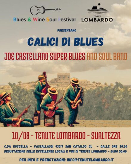 SAN CATALDO. Un grande evento quello che il prossimo 10 agosto sarà ospitato dalle Tenute Lombardo. Si tratta di una serata magica all’insegna del blues e del buon vino. L’evento “Calici di Blues” vedrà protagonista la Joe Castellano Super Blues and Soul Band, nota per le sue grandi performance.
