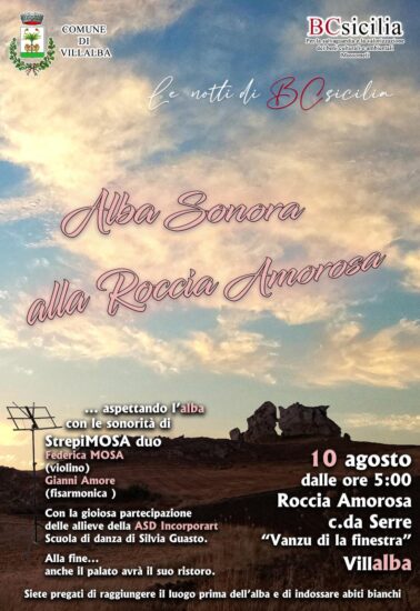 VILLALBA –  Eventi all’alba del 10 agosto con i partecipanti vestiti in bianco nel piccolo comune nisseno. Un appuntamento che vede promotrice l’associazione BC Sicilia col patrocinio del Comune di Villalba. Luogo dell’evento la contrada Serre “Vanzu di la finestra”, per i residenti “la roccia di li ziti”. L’invito ai partecipanti è di raggiungere la località prima delle 5 per potere ammirare l’incantevole panorama che circonda, appunto, la roccia di li ziti..  Aspettando l’alba con le sonarità di StrepiMOSA Duo  Federica Mosa (violino) e Gianni Amore (fisarmonica). Saranno presenti anche le allieve dell’Asd Incorporart Scuola di danza di Silvia Guasto che daranno un tocco magico all’evento. Scrive  Rita La Monica, presidente regionale di BC Sicilia. “ Ci sono luoghi che ci chiamano e non ne conosciamo la ragione. Sono sirene ammantate di vento che profuma di origano, di timo e fiore di cappero e alla cui malìa non si può resistere. Luoghi che tramandano memorie di riti magici, arcane filastrocche, tracce di popoli antichi, mercati notturni e ghiotte truvature.  Proprio lì nell’onphalos della Sicilia agraria, incastonata tra il sali e scendi d’infinite colline che si rincorrono cangianti allo scorrere delle stagioni, proprio lì al culmine di una catena di picchi discontinui si erge silenziosa la Roccia Amorosa, imponente massiccio pietroso, costituito da due blocchi divisi adiacenti, collegati da una pietra centrale, originati, forse, da antichi movimenti tellurici o dalle potenti saette di Zeus. Denominato “Vanzu di la finestra” nelle mappe catastali di Villalba, gli abitanti del luogo la nominano  roccia “di li ziti”, degli innamorati forse in virtù della pietra centrale che alla maniera” di uno schiocco di bacio unisce per l’eternità, in un abbraccio appassionato, i due profili eteroantropomorfi”.