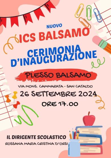 Tutto pronto per l’inaugurazione dell’Istituto Comprensivo Statale “BALSAMO” di San Cataldo, diretto dalla Dirigente Scolastica prof.ssa Rossana Maria Cristina D’Orsi, coadiuvata dalla DSGA, dott.ssa Sara Perricone. La cerimonia, a cui sono invitati a partecipare i genitori dell’istituto, avrà luogo giovedì 26 settembre pomeriggio alle ore 17.00 presso il plesso “Balsamo”, nell’accogliente Aula Magna “Iqbal Mashi”.