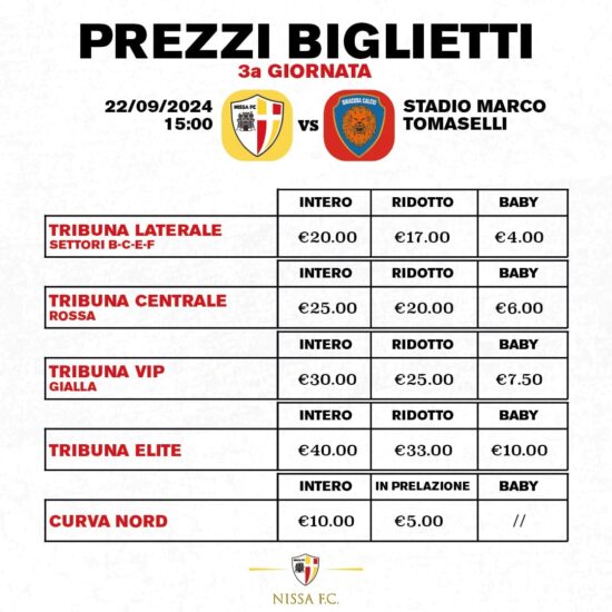 Dopo il pari casalingo 1-1 in “Zona Cesarini” con la Vibonese nel match d’esordio in campionato, la Nissa domenica prossima è impegnata fuori casa contro il Paternò che ha battuto alla prima di campionato il quotato Pompei 0-1. Tuttavia, nell’ambiente biancoscudato l’attenzione è rivolta anche al match del prossimo 22 settembre quando al “Tomaselli” arriverà il forte Siracusa. In quell’occasione, è prevista la Giornata Biancoscudata, per cui gli abbonamenti non saranno validi.