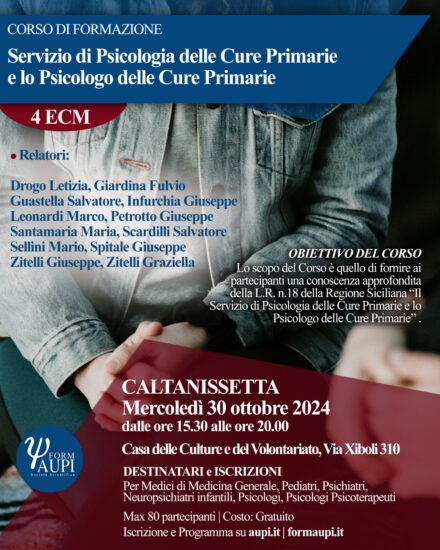 Si terrà a Caltanissetta il 30 ottobre 2024 presso la Casa delle culture e del volontariato, in Via Xiboli 310 a partire dalle 15.30 il corso Il Servizio di Psicologia delle Cure Primarie e lo Psicologo delle Cure Primarie.