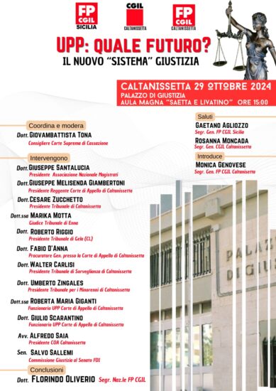 Martedì 29 ottobre alle ore 15:00, presso l’Aula Magna “Saetta e Livatino” del Palazzo di Giustizia di Caltanissetta, si terrà il convegno dal titolo UPP: QUALE FUTURO? Il “nuovo” sistema giustizia. L’incontro, patrocinato da CGIL Sicilia ma con l’auspicata partecipazione dei rappresentanti delle altre sigle sindacali maggiormente rappresentative, costituirà preziosa occasione di confronto sulla nuova struttura dell’Ufficio per il Processo e l’impatto sul sistema Giustizia.