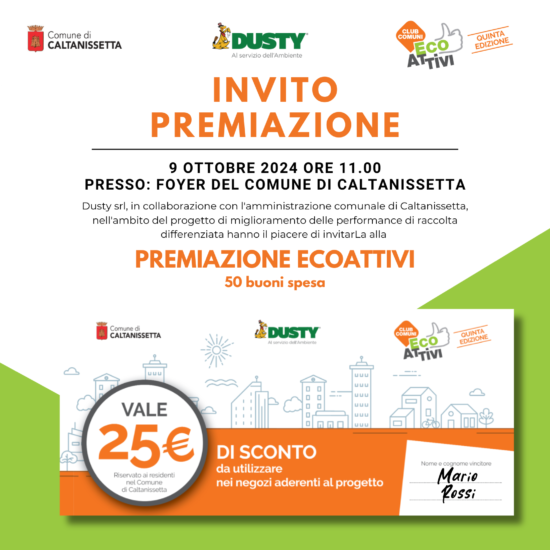 La cerimonia di premiazione dei 50 cittadini vincitori si terrà mercoledì 9 ottobre 2024 alle ore 11 presso il foyer del Comune di Caltanissetta, alla presenza delle autorità locali, tra cui il Sindaco Walter Tesauro, il Responsabile dei Servizi Ambientali Dusty di Caltanissetta Mario Meli, i rappresentanti di Achab Group, e naturalmente i cittadini vincitori.