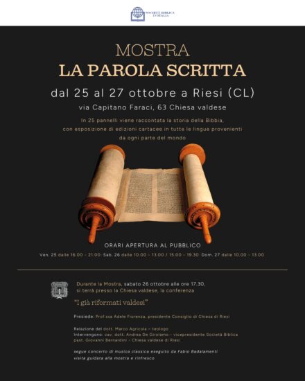La Bibbia è un libro universale, patrimonio di tutta l’umanità, che attraversa i secoli e le culture, rimanendo attuale. Pur essendo presente nella vita quotidiana di milioni di persone, in pochi conoscono veramente la profondità e la ricchezza del suo messaggio. Un testo che offre riflessioni e insegnamenti che parlano ancora oggi a chi lo legge. L’occasione per approfondire e scoprire la Bibbia sarà la mostra “La Parola Scritta” della Società biblica in Italia, che si terrà nella Chiesa valdese di Riesi (Caltanissetta) dal 25 al 27 ottobre. Il percorso della mostra si snoda attraverso 25 pannelli scritti e illustrati. Vi è annessa l’esposizione di volumi provenienti da ogni parte del mondo con edizioni in varie lingue.