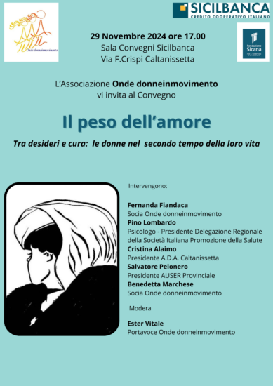 Una maggiore sensibilizzazione e politiche più inclusive potrebbero aiutare a riequilibrare la distribuzione dei carichi di cura e potrebbero offrire maggiore supporto a chi svolge questa attività, indipendentemente dal genere. L’Associazione Onde donneinmovimento promuove per il 29 novembre 2024 alle ore 17.00, nella sala Conferenze della Fondazione Banca Sicana, un convegno dal titolo: “Il peso dell’amore” per cercare di squarciare il velo di ipocrisia che imprigiona le donne in questa abnegazione senza riconoscimento della fatica e del sacrificio.