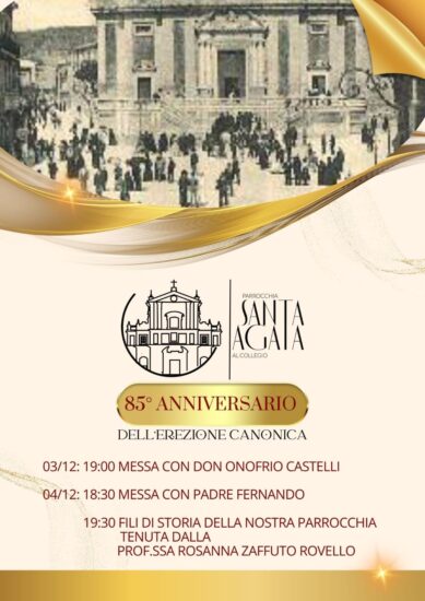 Mercoledì 4 dicembre la messa sarà celebrata alle ore 18:30. Di seguito alle ore 19:30 la prof. Rosanna Zaffuto Rovello, scrittrice e acclarata storica della città, illustrerà ai presenti la storia della chiesa Sant’Agata.