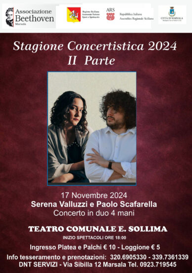 Il concerto del duo pianistico Valluzzi – Scafarella è il quarto appuntamento della seconda parte della Stagione Concertistica 2024 promossa dall’Accademia Beethoven di Marsala, presieduta dal Maestro Giuseppe Lo Cicero che si conferma ancora una volta protagonista di primo piano nella promozione della cultura musicale sul territorio siciliano. Grazie alla lungimiranza del Maestro Lo Cicero e all’impegno dell’Accademia, il pubblico marsalese avrà l’opportunità di assistere a un concerto di assoluto rilievo, impreziosito dalla presenza di due talenti emergenti della scena pianistica italiana.