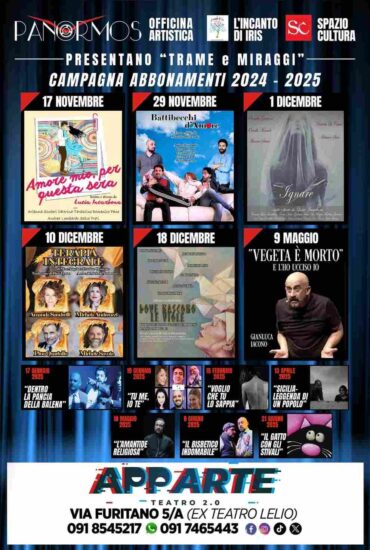 La prima stagione della rassegna “Trame e miraggi” 2024/2025 è realizzata grazie a Panormos Officina Artistica in collaborazione con L’Incanto di Iris e Spazio Cultura. Per maggiori informazioni e prenotazioni è possibile contattare i numeri 091 8545217 / 091 7465443 (solo WhatsApp) o inviare un’email a info@panormos.info.