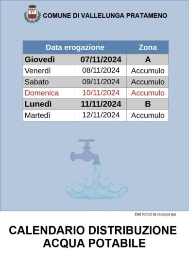 VALLELUNGA. Il sindaco Giuseppe Montesano ha comunicato alla cittadinanza il calendario per la distribuzione d’acqua presso le abitazioni del centro abitato. Questo il calendario: