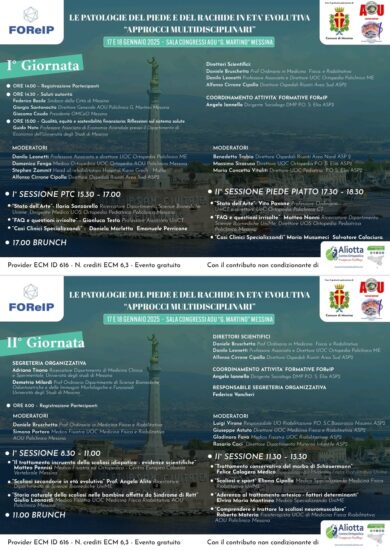 Si svolgerà nelle giornate del 17 e 18 gennaio 2025 presso la sala congressi dell’ Azienda Ospedaliera Universitaria G. Martino Policlinico di Messina il convegno ECM organizzato dalla FOReIP di Caltanissetta con il contributo del Centro Ortopedico Aliotta dal titolo “Le Patologie del Piede e del Rachide in Età Evolutiva – Approcci Multidisciplinari ” patrocinato dal Comune di Messina, AOU Policlinico di Messina e OMCeO Messina.
