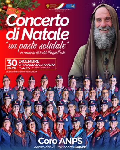 Oggi, 30 dicembre 2024, alle ore 19:30, presso la Missione Speranza e Carità fondata da Biagio Conte a Palermo, si terrà il concerto di Natale “Un Pasto Solidale ricordando Biagio Conte”. L’evento, a ingresso libero, vedrà l’esibizione del Coro dell’Associazione Nazionale Polizia di Stato (ANPS) di Palermo, diretto dal Maestro Raimondo Capizzi accompagnato dai maestri Zimmardi e Clemente.