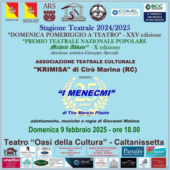 CALTANISSETTA. Domenica 9 febbraio 2025, come sempre alle ore 18.00, e come sempre al Teatro Oasi della Cultura, avrà luogo il settimo appuntamento della XXV Stagione “Domenica pomeriggio a Teatro”,organizzata dal Teatro Stabile Nisseno con la Direzione artistica di Giuseppe Speciale.