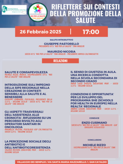 Il suo intervento si concentrerà sull’importanza della consapevolezza di sé come elemento chiave per adottare comportamenti preventivi, fondamentali per la salute e il benessere a lungo termine. Essere consapevoli del proprio corpo, delle emozioni e delle abitudini quotidiane consente infatti di mettere in atto strategie efficaci per prevenire le malattie e migliorare la qualità della vita. Il tema della creazione di condizioni favorevoli alla salute e al benessere nei diversi contesti sarà approfondito, anche sotto il profilo operativo, da Giuseppe Lombardo, psicologo e Presidente della Delegazione Regionale della Società Italiana per la Promozione della Salute. A seguire, Marinella Faletra, psicologa, illustrerà i primi risultati di un progetto in corso presso il reparto di oncologia dell’ospedale Sant’Elia di Caltanissetta, evidenziando l’importanza della promozione del benessere in ambito ospedaliero e tra gli operatori impegnati nella cura delle malattie croniche. Valeria Mistero, Educatore Professionale, presenterà i dati preliminari di una ricerca recentemente avviata sull’antibiotico-resistenza, un tema che rappresenta già oggi un’emergenza sanitaria non solo a livello nazionale; lo farà nel contesto della relazione medico-paziente, un aspetto cruciale per la promozione della salute. Per quanto riguarda il contesto scolastico, Maria Luisa Sposito, Educatore Professionale, presenterà i risultati di una ricerca condotta con studenti di alcune scuole secondarie di secondo grado, focalizzandosi sul benessere scolastico e, in particolare, sulla percezione della giustizia in classe. Infine, sempre nell’ambito scolastico, Andrea Giugno, Educatore Professionale, offrirà alcune riflessioni sulle opportunità fornite dal programma delle Scuole Promotrici di Salute, un’iniziativa di grande rilevanza per la nostra regione e un impegno prioritario per la SIPS nella provincia di Caltanissetta. I lavori si terranno a San Cataldo, Villaggio dei Semplici, via S.M. Mazzarello 1 a partire dalle 17:00, il 26 febbraio. Moderatore Enzo Cusimano, socio dell’ APS “Noi per la Salute” e nel passato Dirigente Scolastico; concluderà l’incontro Michele Rizzo. La SIPS è una società scientifica che dal 2012 nel nostro paese è impegnata nel sostenere la promozione della salute in ogni contesto, secondo le migliori pratiche e le prove di efficacia disponibili. L’APS “Noi per la salute – Tina Anselmi” svolge un’intensa attività a favore dell’affermazione del diritto alla salute e a garanzia del funzionamento del servizio sanitario nazionale; tramite i suoi “sportelli”, affidati a volontari, è impegnata in attività di consulenza ai cittadini sull’accesso alle prestazioni sanitarie e sull’annosa problematica delle liste d’attesa. Ha promosso numerosi incontri su temi di grande rilevanza per la funzionalità e la sostenibilità del sistema sanitario.