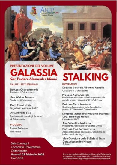CALTANISSETTA. Venerdì 28 febbraio 2025, alle ore 16.30, nella sala convegni del Consorzio Universitario di Caltanissetta, sarà presentato il volume “Galassia Stalking”, del Vice Questore della Polizia di Stato Alessandro Miconi.