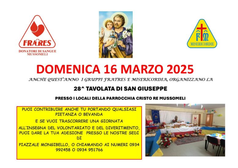 MUSSOMELI – Fratres e Misericordia non dimenticano anzi promuovono le loro attività e lo fanno con spirito volontaristico che caratterizza il loro operato. E così per domenica prossima, in occasione dell’anticipata festa di San Giuseppe, è stata organizzata la“Tavolata di San Giuseppe. Una tradizione, datata da oltre quattro decenni che per gli anzidetti gruppi rappresentato appuntamenti quasi istituzionalizzati. “li vicchiariaddi di San Giuseppi”, come inizialmente l’evento veniva chiamato, era un evento atteso specialmente dalle persone che vivevano la loro quotidianità in solitudine o in stato di disagio sociale. Una iniziativa, a cui i due sodalizi non hanno mai rinunciato, portata avanti con entusiasmo e partecipazione, soprattutto per fare trascorrere alcune ore della giornata in compagnia, fuori dalle proprie mura domestiche, per spezzare la monotonia della quotidianità. Anche quest’anno saranno alcune decine di persone (20 – 30) che siederanno a tavola, servite dai volontari che si renderanno disponibili in questa circostanza. Una tavolata imbandita dai diversi benefattori che, in tempo utile, si premureranno a fare pervenire l’occorrente. Va anche detto che in tempi passati la “tavolata di San Giuseppe” veniva allestita presso la sede dei due sodalizi (Inizialmente in via Elio Vittorini e successivamente presso le sedi di Piazzale Mongibello. Da alcuni anni, invece, vengono utilizzati i locali parrocchiali di Cristo Re. Intanto, i promotori fanno sapere che alle 12,30 presso la Parrocchia di Cristo Re è prevista la benedizione della tavola e che a partire dalle ore 8 fino alle 12, chi vuole può portare la pietanza, dolce o bibite per allestire la tavola.