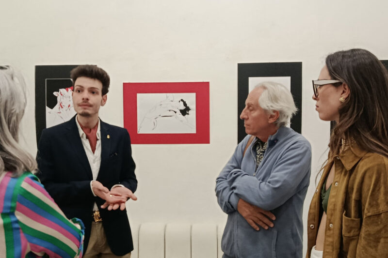 Dopo un breve intervento introduttivo del curatore Gigi Vinci e della gallerista Gigliola Beniamino Magistrelli, è stato lo stesso artista a prendere la parola guidando i presenti in un viaggio immaginifico e surreale attraverso le opere esposte, realizzate interamente in china su carta. Il racconto mitologico si è intrecciato con la materia grafica, dando vita a un universo visivo denso di significati simbolici e suggestioni poetiche. Figure come Narciso, Medusa, Didone e Pan non sono state rappresentate in chiave naturalistica, bensì evocate come presenze evanescenti, tracce di un sacro ormai scomparso ma ancora capace di risuonare nell’animo contemporaneo. La tecnica dell’inchiostro, abilmente gestita da Di Paola, ha dato vita a opere ricche di profondità e movimento, apprezzate sia dal pubblico che dalla critica. Nonostante la giovane età, l’artista si è mostrato maturo e consapevole nel raccontare il proprio percorso creativo. Le sue carte, segnate da china nera esaltata da tocchi blu e rossi, uniscono precisione del tratto e libertà esecutiva, fondendo tradizione classica e ricerca contemporanea. Ogni opera sembra nascere da un dialogo tra conscio e inconscio, in cui il nero della china evoca l’oblio e le colature raccontano il tempo che scorre e la memoria che si dissolve.