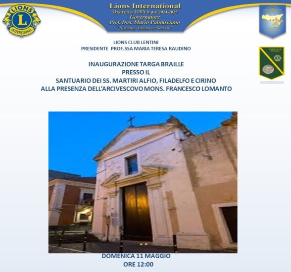 Sarà consegnata a don Maurizio Pizzo, parroco della chiesa Santa Maria e Sant’Alfio di Lentini, rettore del Santuario dei Santi Martiri Alfio, Filadelfo e Cirino – Chiesa della Fontana di una targa in braille da parte del Lions club di Lentini. La cerimonia d inaugurazione si svolgerà, domenica prossima, 11 maggio, alle 12, davanti al Santuario dei Santi Martiri Alfio, Filadelfo e Cirino alla presenza dell’arcivescovo di Siracusa mons. Francesco Lomanto e del sindaco di Lentini Rosario Lo Faro. La targa, sarà collocata all’ingresso del Santuario ed introdurrà il percorso storico, artistico e culturale all’interno della chiesa. L’iniziativa del Lions clubs si inserisce sul tema internazionale “Lascia la tua impronta, dai forma al nostro futuro” e sostenuto dal Governatore del distretto 108YB Sicilia Mario Palmisciano .