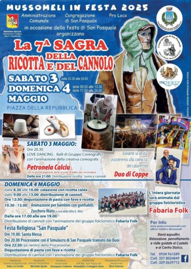 MUSSOMELI – Mussomeli in festa per la sagra della ricotta e del cannolo. E’ la settima edizione dell’evento che nei primi di maggio entra in azione. Due giorni (solitamente sabato e domenica) in cui la promozione del territorio e la valorizzazione dei prodotti locali si impongono all’attenzione di quanti non lasciano sfuggire i fine settimana per i loro weekend gastronomici. Degustazione di ricotta e di cannolo, ma quest’anno c’è anche la degustazione dalla pasta con le fave, o come localmente viene chiamata “fritteddra”. Ma oltre alla gastronomia c’è spazio anche per altre attività che si svolgeranno durante l’arco delle due giornate sia per i bambini, per i giovani e meno giovani. Infatti sabato sera, dalle 20,30 entrano in campo le scuole di ballo del circondario con l’animazione della coreografa Petronela Calciu. E’ previsto anche l’intrattenimento dei cabarettisti Duo di Coppe; dalle ore 21 alle 24 degustazione ricotta, tuma e cannolo. La domenica si inizia alle ore 8,30 alle 10,30 con la colazione con la ricotta calda; dalle 9 alle 13 distribuzione di cannoli, alle ore 12,30 degustazione di pasta con fave e ricotta; dalle 10,30 alle 13, zucchero filato e animazione per bambini con gonfiabili; dalle 17 alle 19 animazione gruppo folcloristico Dabaria Folk. Il programma, che porta le firme dell’assessore al turismo Seby Lo Conte, dell’assessore alle attività produttive Michele Spoto, del presidente dell’associazione San Pasquale Alessandro Noto, della presidente della Proloco Zina Falzone e del sindaco on. Giuseppe Catania, rileva anche i momenti della festa religiosa di San Pasquale con messa alle 19 e successivamente, alle 20, la processione con il simulacro di San Pasquale trainato dai buoi. Al rientro della processione degustazione di pasta con fave e ricotta.
