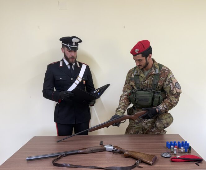 Procedendo ad accurata ispezione dei luoghi, all’interno di uno dei veicoli e di una cisterna i Carabinieri hanno rinvenute, ben occultate e protette dagli agenti atmosferici, due armi da fuoco con matricole abrase, una carabina calibro 22 LR marca ZOM451 e un fucile sovrapposto calibro 12 nonché una ventina di cartucce cal. 12 a palla unica e spezzata.