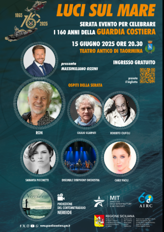 Il prossimo 15 giugno 2025, alle ore 20.30, lo straordinario scenario del Teatro Antico di Taormina farà da cornice a “Luci sul mare”, una serata evento dedicata alla Guardia Costiera, che celebra quest’anno il 160° anniversario dalla sua fondazione. Un appuntamento unico, realizzato con il Ministero delle Infrastrutture e dei Trasporti, per rendere omaggio agli 11.000 uomini e donne che ogni giorno operano al servizio del Paese e della collettività. Nel corso della serata si terrà la cerimonia di consegna dei “Guardia Costiera Awards”, un riconoscimento speciale assegnato ai Comandi che si sono distinti nell’ultimo anno per operazioni e interventi di particolare rilievo, in mare e lungo le coste italiane. Un momento solenne e significativo che vuole valorizzare l’eccellenza, il coraggio e la dedizione di chi ogni giorno garantisce la sicurezza e la salvaguardia della vita umana in mare. L’evento avrà inoltre una finalità benefica a favore di Fondazione AIRC per la ricerca sul cancro, riaffermando l’impegno della Guardia Costiera anche nel campo della solidarietà.