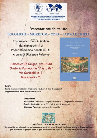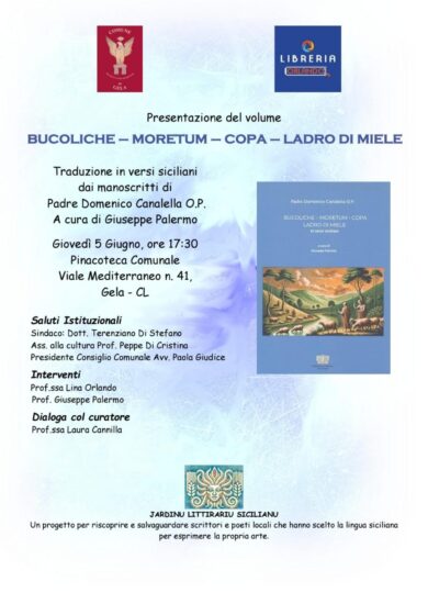 Questa iniziativa rappresenta un altro traguardo tra quelli già raggiunti e quelli in programma per la prossima stagione estiva, ma ci stava particolarmente a cuore. Come sosteneva Pasolini: “A una lingua omologata e omologante si deve opporre il senso profondo della lingua latina o il senso vero ed esistenziale di quella dialettale”. Un bellissimo pomeriggio, vissuto con grande partecipazione”. Ed il prof. Giuseppe Palermo “Ringrazio sinceramente l’Assessore Peppe Di Cristina del Comune di Gela per le parole di stima e per il patrocinio accordato alla presentazione del volume “Bucoliche – Moretum – Copa – Ladro di miele” tradotti in versi siciliani, che ho avuto l’onore di curare. Le sue considerazioni sull’opera e sull’importanza della lingua come espressione identitaria profonda mi hanno particolarmente colpito e gratificato. Un grazie sentito anche per aver ricordato il prezioso contributo delle professoresse Lina Orlando e Laura Cannilla, nonché il sostegno istituzionale della Presidente del Consiglio Comunale, Paola Giudice. Condivido pienamente la citazione di Pasolini: oggi più che mai è necessario riscoprire il valore esistenziale delle lingue “altre”, capaci di restituire radici, umanità e visione. L’incontro, partecipato e ricco di significato, ne è stata la dimostrazione più autentica. Un ringraziamento particolare va anche alla Signora Rosy Calà, autrice di tre illustrazioni dell’opera, che è venuta da Mussomeli per partecipare all’evento”. Intanto, c’è da dire che domenica prossima, 15 giugno alle 18:30, presso l’Oratorio della Chiesa di Cristo Re, di Mussomeli, promosso dalla Fidapa di Mussomeli, di cui è presidente Maria Teresa Canalella, è previsto un altro incontro per conoscere le opere del mussomelese Padre Domenico Canalella O.P., nell’ambito del progetto “JARDINU LITTIRARIU SICILIANU”, che punta a riscoprire e valorizzare scrittori e poeti locali che hanno scritto in lingua siciliana.
