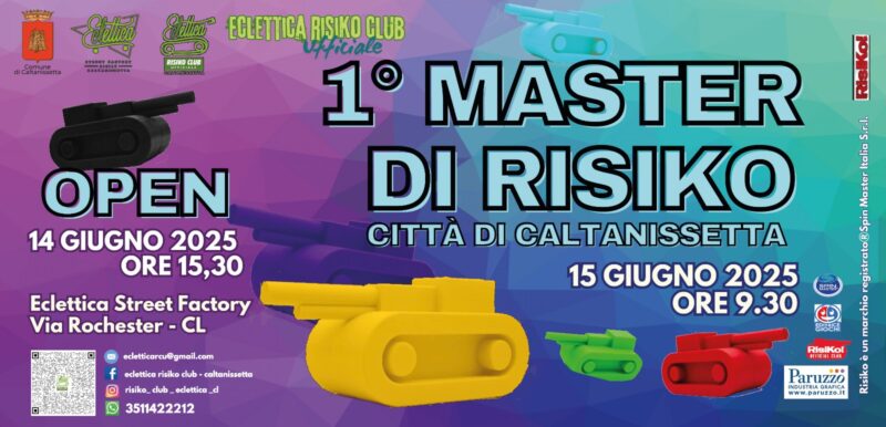 Il I° Master “Città di Caltanissetta”, organizzato dal Risiko Club Ufficiale nisseno con il patrocinio del Comune di Caltanissetta, è uno dei tredici Master nazionali assegnati da Editrice Giochi ai RCU che si distinguono pe l’attività svolta e per il radicamento nel proprio territorio.