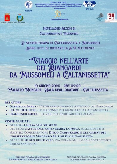 S’intitola “Viaggio nell’arte dei Biangardi: da Mussomeli a Caltanissetta” l’evento che il 10 giugno 2025, a partire dalle ore 9:00, animerà la Sala degli Oratori di Palazzo Moncada, nel cuore di Caltanissetta. L’iniziativa nasce dal gemellaggio tra le sezioni Fidapa di Caltanissetta e Mussomeli, e celebra la straordinaria produzione artistica della famiglia Biangardi.
