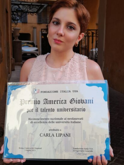 Lo scorso primo luglio la Fondazione Italia Usa ha conferito alla nissena Carla Lipani il “Premio America Giovani” alla Camera dei Deputati, per il merito e il talento universitario rientrando così nei 1000 migliori neolaureati nelle università italiane.