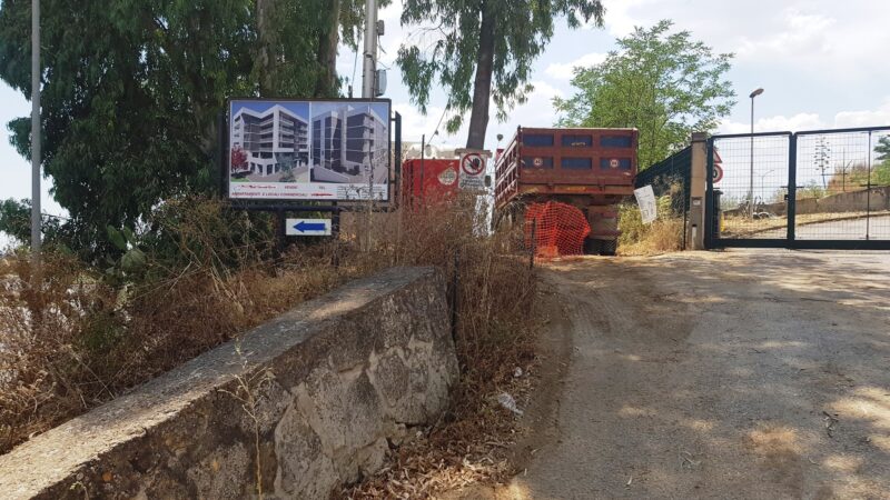 Infine, il terzo luogo. Siamo nello spazio adiacente all’ingresso dell’ITET Rapisardi Da Vinci, nel punto in cui via Gaetano Costa e via Filippo Turati convergono in una rotatoria; in uno di quei residui frammenti della campagna nissena che connotano le parti più periferiche della città. Bene: in questo spazio, in questo luogo è stato impiantato di recente un cantiere edile finalizzato alla realizzazione di un fabbricato che conterrà appartamenti e locali commerciali.