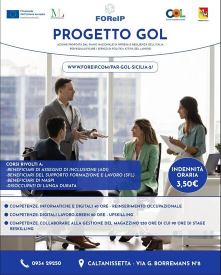 Saranno avviati entro il mese di settembre 2025 i corsi del programma Regionale GOL della FOReIP presso le sedi del noto Ente nisseno site in Caltanissetta Via G.Borremans n.8, Niscemi Via R.Elena n. 95, Mussomeli Via Gentile n.1.