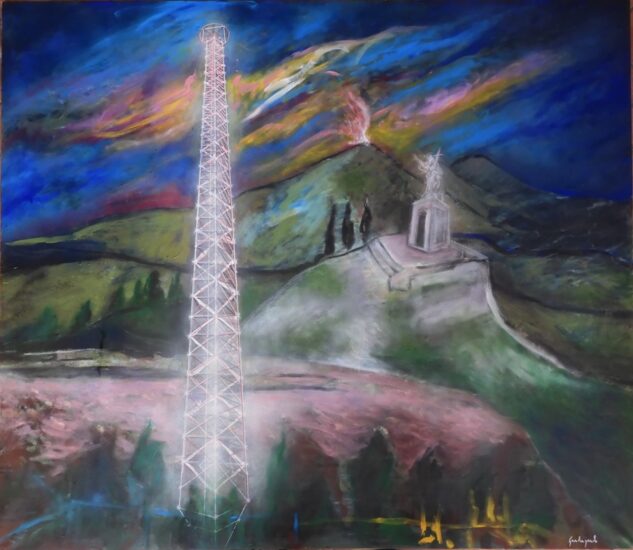 L’opera di Francesco Guadagnuolo si configura quale esempio di pittura-architettura: un manifesto visivo in cui l’antenna RAI diventa narrazione transrealista e “Cattedrale di Luce”.