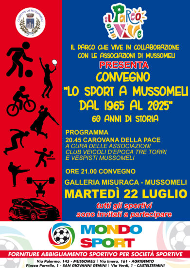 MUSSOMELI – Si svolgerà martedì 22 luglio 2025 all’h 21.00 presso i locali della galleria Misuraca in via Palermo, il convegno sullo sport ‘’ Lo sport a Mussomeli dal 1965 al 2025 sessant’anni di storia’’, organizzato da “ll parco che vive” in sinergia con le associazioni sportive del territorio. L’invito degli organizzatori è esteso a tutti gli sportivi che hanno praticato, calcio, basket, pallavolo, tennis, freccette, Karate, nuoto, ciclismo, rally tennis tavolo, atletica e altri sport sono invitati a partecipare. Evento unico nel suo genere, un vero viaggio nel tempo fatto di passione, sacrifici. Da sottolineare che prima della kermesse, l’associazione club macchine d’epoca tre Torri, ed il gruppo vespisti di Mussomeli organizzeranno la carovana della pace, una sfilata con macchine e vespe d’epoca, con un messaggio contro le guerre, seguirà un raduno nella centralissima via Palermo. Appuntamento per il raduno alle 20,30 Via Palermo. L’ iscrizione gratuita.
