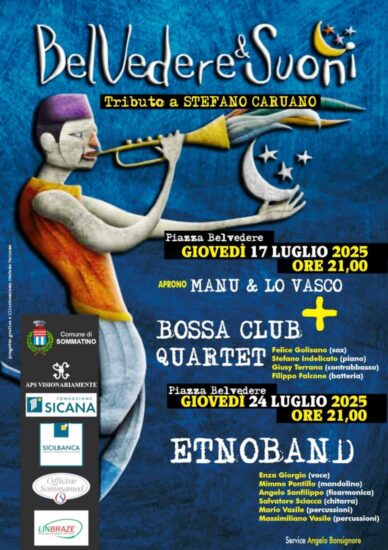 Come ogni anno, nel giorno del suo compleanno, amici e parenti dell’artista Stefano Caruano, scomparso prematuramente 5 anni fa, organizzano un concerto tributo in sua memoria, nella piazza Belvedere di Sommatino, dove nei primi anni 2000 si svolse una rassegna musicale dal titolo “Belvedere & Suoni” fortemente voluta dall’artista e appassionato di musica sommatinese. E così giovedì prossimo 17 Luglio alle ore 21, con il supporto del Comune di Sommatino, della Fondazione Sicana e di alcuni sponsor privati, si esibiranno sul palco allestito nella Piazza Belvedere Manù e Lo Vasco, che apriranno il concerto, ed a seguire il Bossa Club Quartet composto da Felice Golisano al sax, Stefano Indelicato al piano, Giusy Terrana al contrabasso e Filippo Falcone, grande amico di Stefano Caruano, alla batteria.