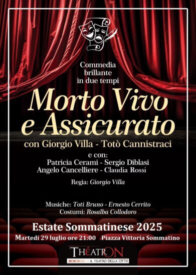 SOMMATINO. Prosegue il programma degli eventi dell’Estate Sommatinese 2025. L’Amministrazione Comunale, in questo senso, è lieta di invitare la cittadinanza alla commedia brillante in due tempi “Morto, vivo e Assicurato”.